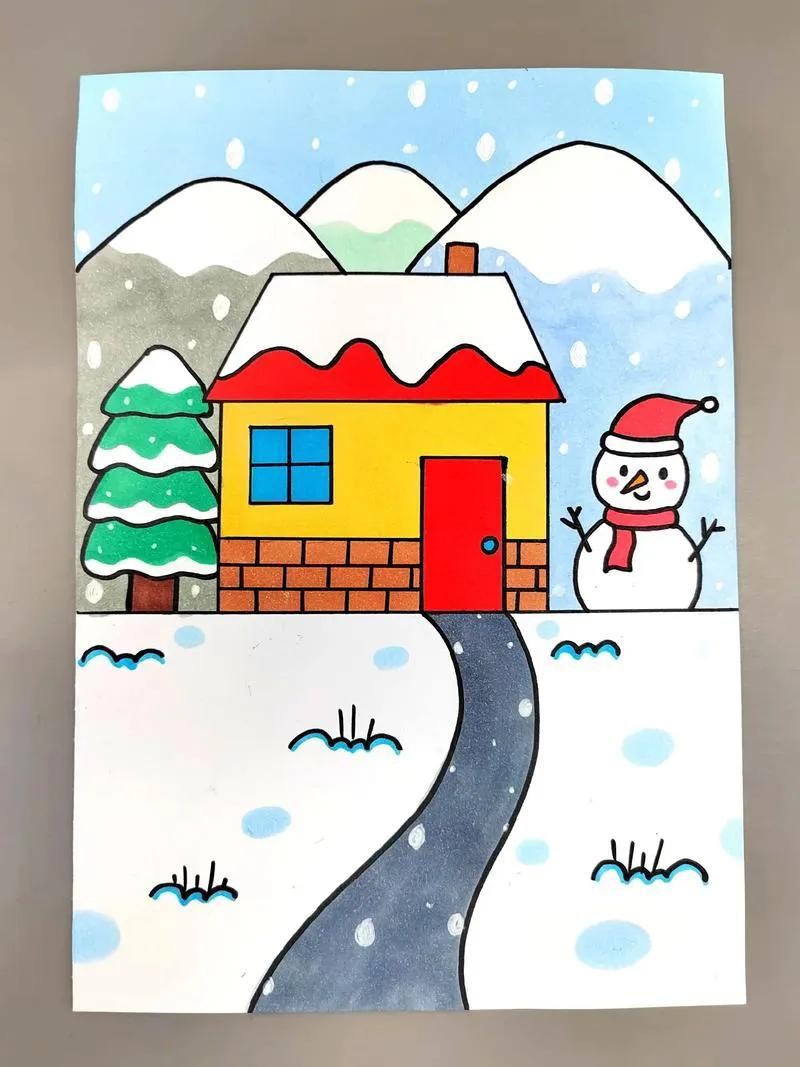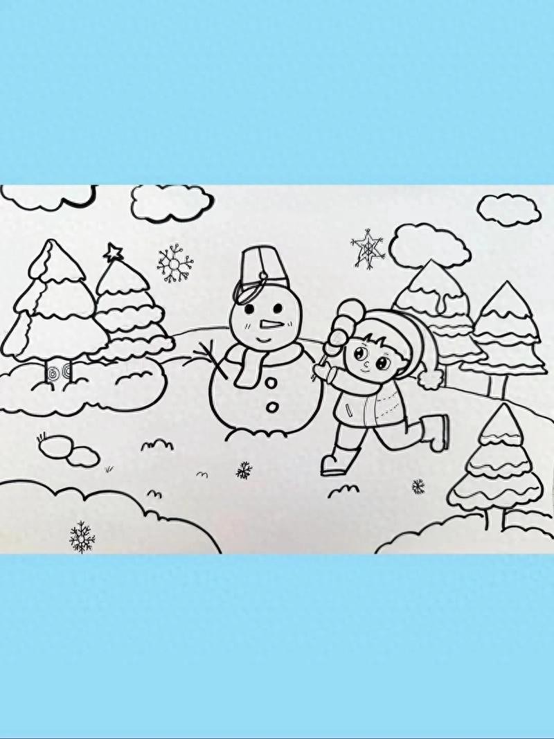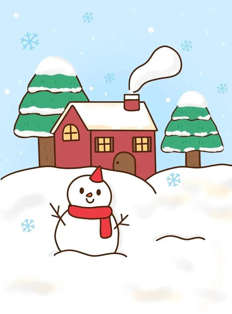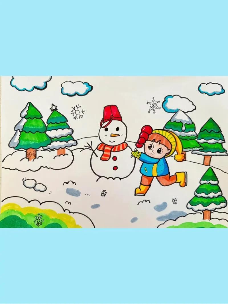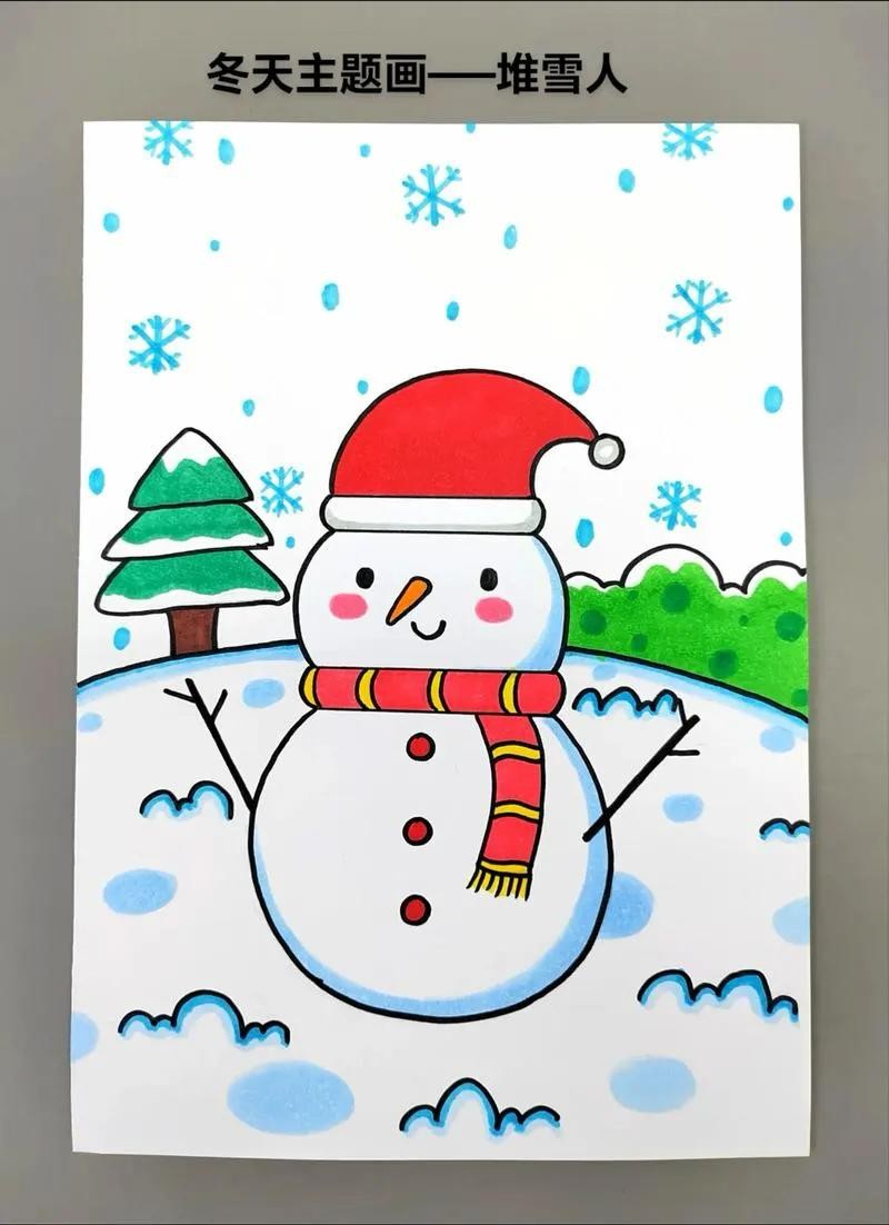 2. 中间及下方的大部分区域用来绘制雪人。先画一个大大的雪人轮廓,雪人的身体用两个重叠的圆形表示,头部是较小的圆形。给雪人戴上红色的帽子、围巾,用胡萝卜做鼻子,画上眼睛、嘴巴,用树枝做手臂。在雪人周围,用白色颜料或白色蜡笔绘制雪花纷飞的场景,可以画一些大小不一的雪花,用蓝色马克笔在底部画出雪地的感觉。
