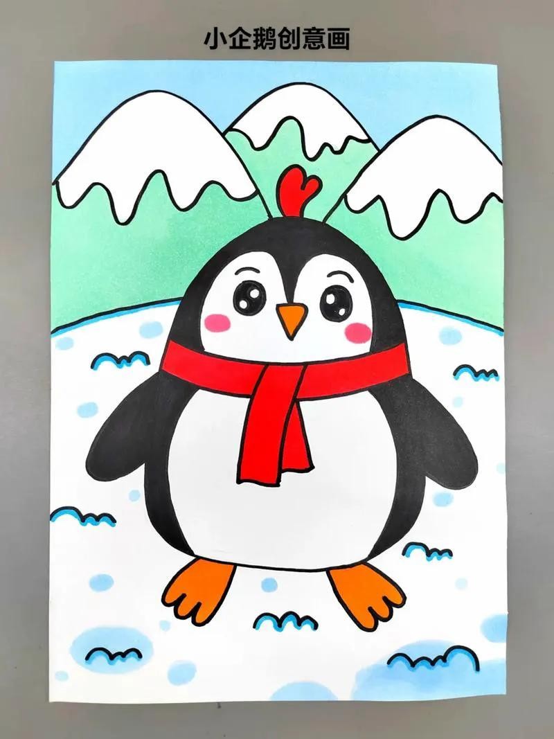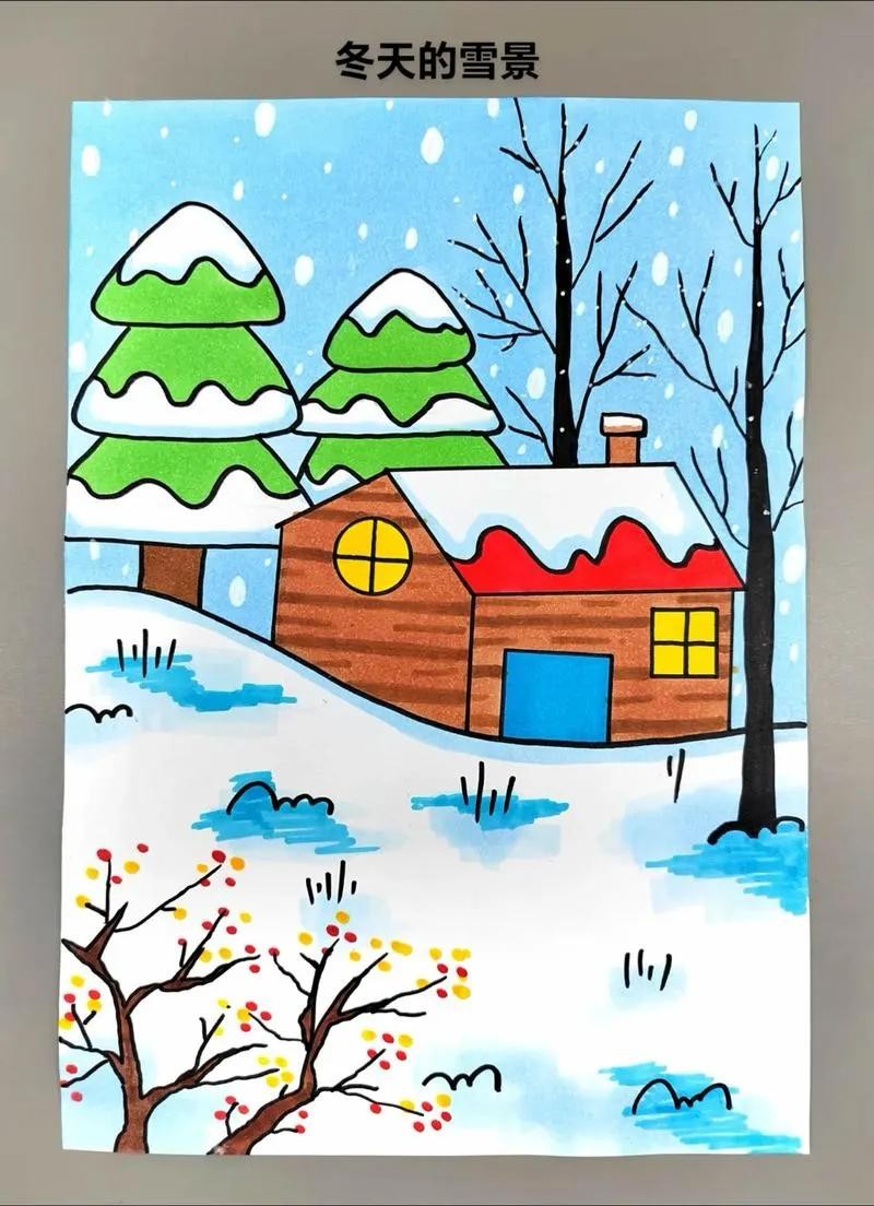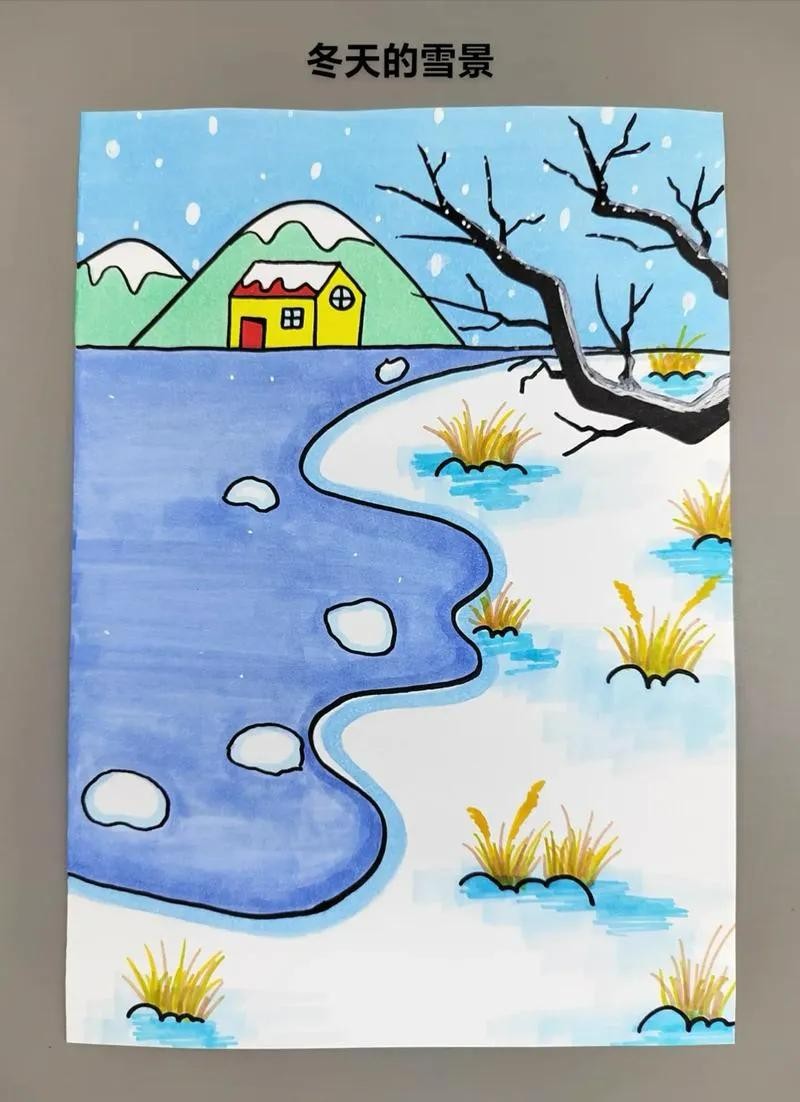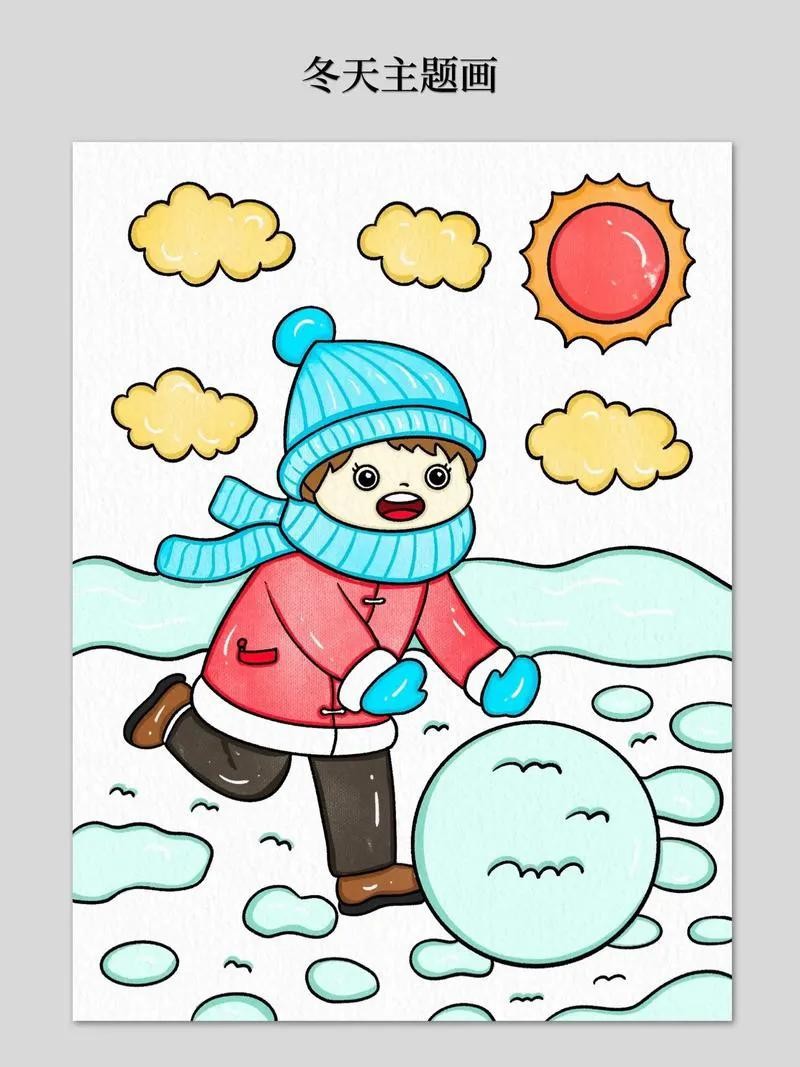2. 中间及下方的大部分区域用来绘制雪人。先画一个大大的雪人轮廓,雪人的身体用两个重叠的圆形表示,头部是较小的圆形。给雪人戴上红色的帽子、围巾,用胡萝卜做鼻子,画上眼睛、嘴巴,用树枝做手臂。在雪人周围,用白色颜料或白色蜡笔绘制雪花纷飞的场景,可以画一些大小不一的雪花,用蓝色马克笔在底部画出雪地的感觉。