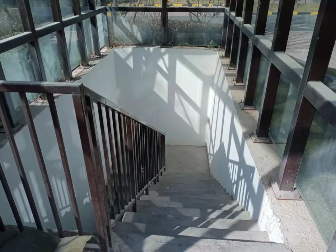 居民前往地下通道入口并没有专门的道路,而且地下通道入口与地面持平,如果遇到大雨很容易造成雨水倒灌地下车库。通道入口处以及楼梯的下面没有看到排水系统,这不免让人担心雨水倒灌后会造成严重内涝。通往地下的楼梯也很狭窄,并没有设置无障碍通道。业主担心地下车库一旦发生火灾通过这个狭窄的通道很难逃生。