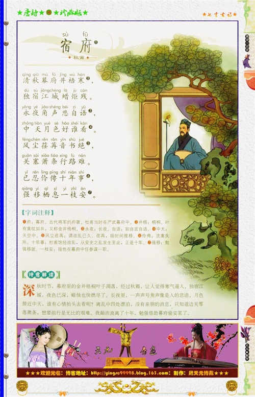 严武死后,他东下夔州,定住三年。代宗李豫大历三年,全家入湖南。他出身寒微,生于唐代由鼎盛到衰败的动乱时代,流离漂泊,生活困苦。深感百姓苦难,于是写下了大量的真实反映这一时代的伟大诗篇。被誉为“诗史”。