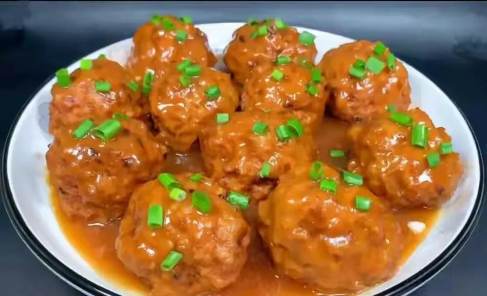 5、然后把里面的料渣捞出来不要,接着开大火把汤汁烧开,加入适量的水淀粉,把汤汁熬至粘稠,最后来一点香油增加香味,搅拌均匀,把熬好的汤汁浇在狮子头上面,最后撒上一点小葱花,一道好吃的狮子头就做好啦。