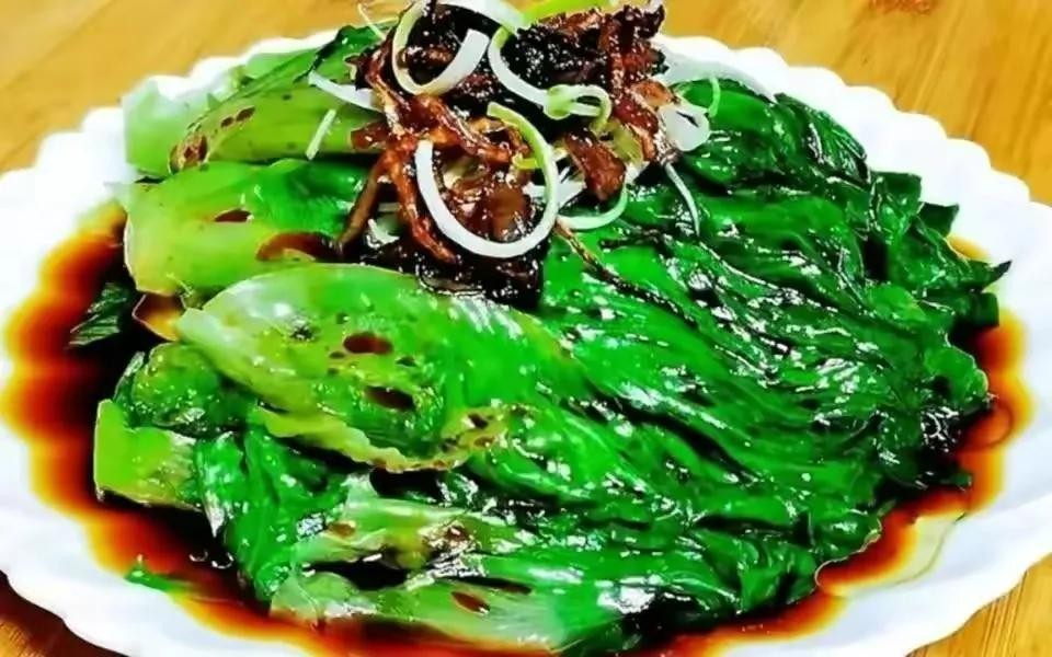 4、锅中加入清水烧开,把生菜放入锅中焯水,加入少许盐,淋入几滴的食用油,可以让生菜翠绿不发黑。叶子微微发软捞出控干水分,放在盘中,加点葱丝。浇上热葱油激发出香味,再淋上料汁,就做好了。