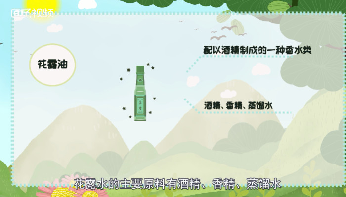 花露水是用花露油作为主体香料,其主要成分为:橙花油、玫瑰香叶油、柠檬油、安息香酸、香柠檬油、酒精。现今有些市售的花露水含有薄荷醇、冰片,使之更为清凉。配以酒精制成的一种香水类产品。花露水的主要原料有酒精、香精、蒸馏水,并辅以少量螯合剂柠檬酸钠、抗氧剂二叔丁基对甲酚等。