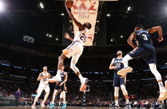 上半场争夺,双方不分伯仲,没有布克的太阳打得非常主动,艾顿和布里奇斯一内一外撑起进攻,太阳顺势确立领先,锡安也是手感火热,半场砍下15分助鹈鹕紧咬。