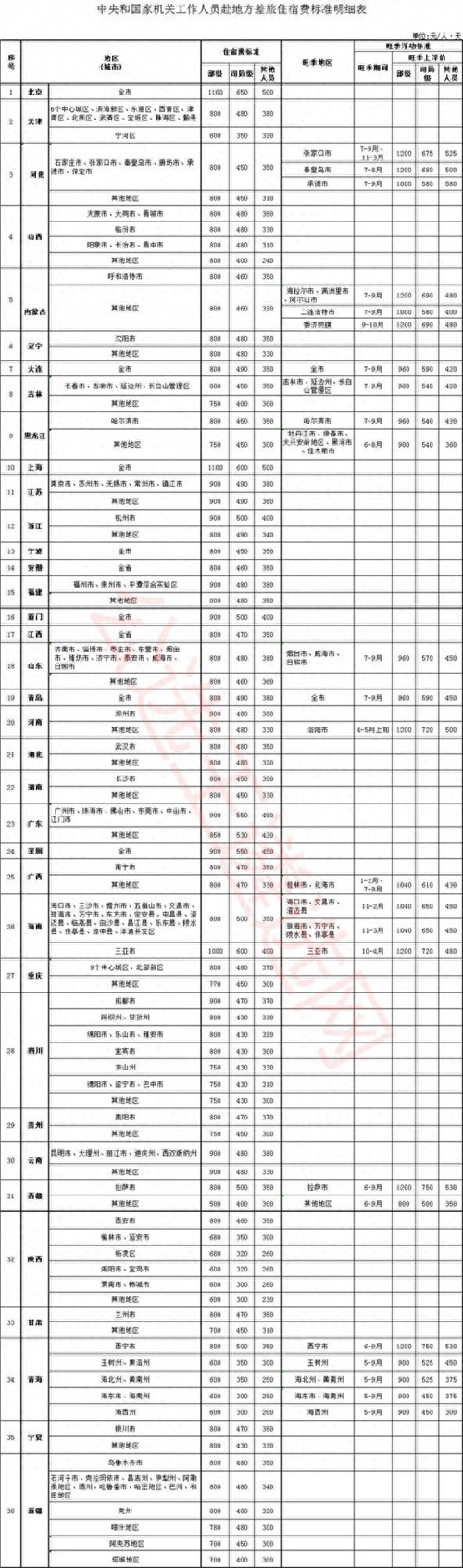 部级官员赴天津、河北、山西、内蒙、辽宁、大连、吉林等地,住宿费标准每天限额多为800元。