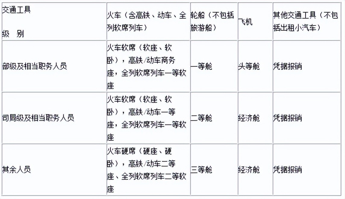 城市间交通费是指工作人员因公到常驻地以外地区出差乘坐火车、轮船、飞机等交通工具所发生的费用。出差人员应当按规定等级乘坐交通工具。乘坐交通工具的等级见下表: