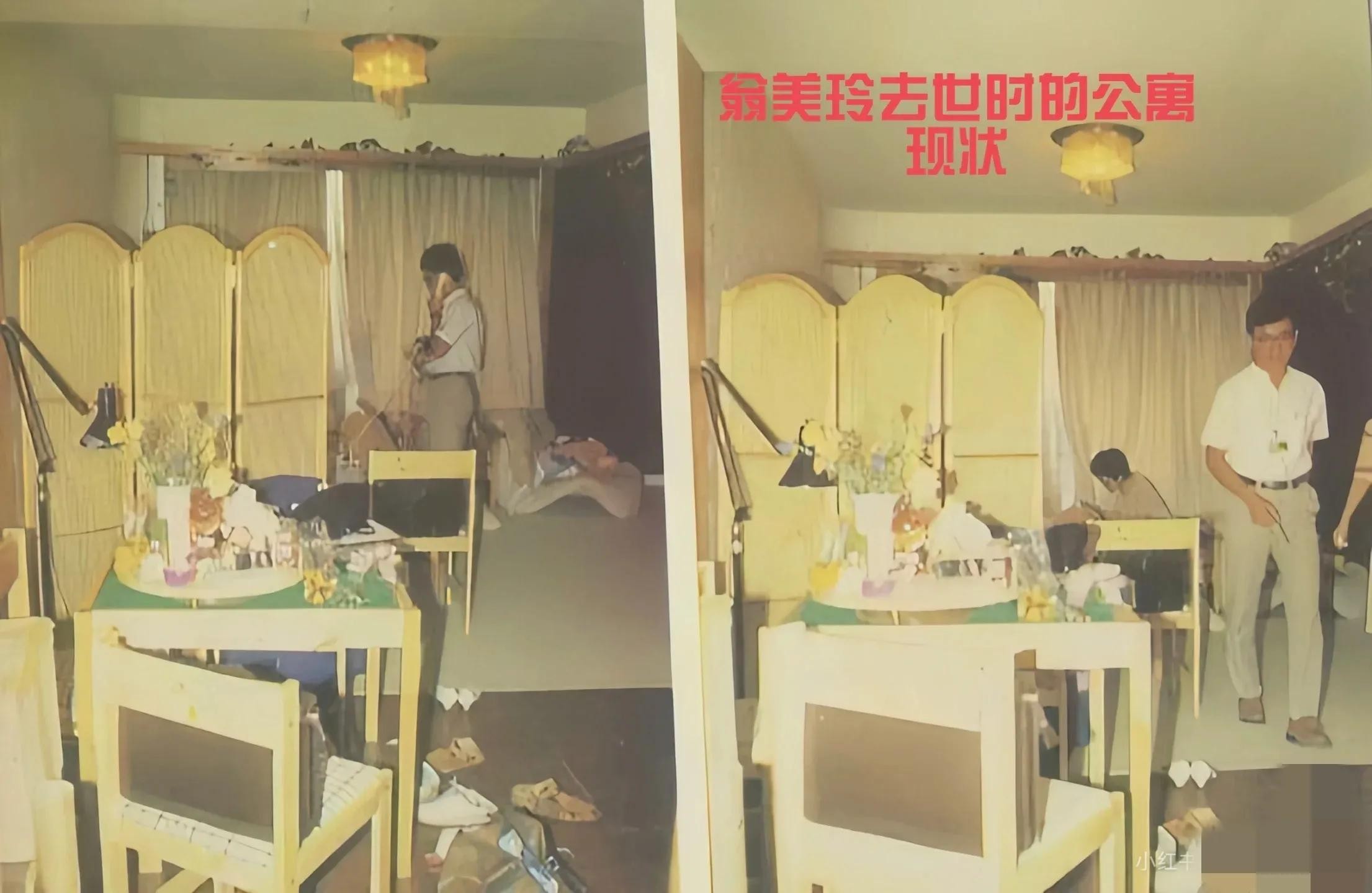 1985年,翁美玲去世当天的照片,遗体被殡仪馆拉走,寓所内很凌乱