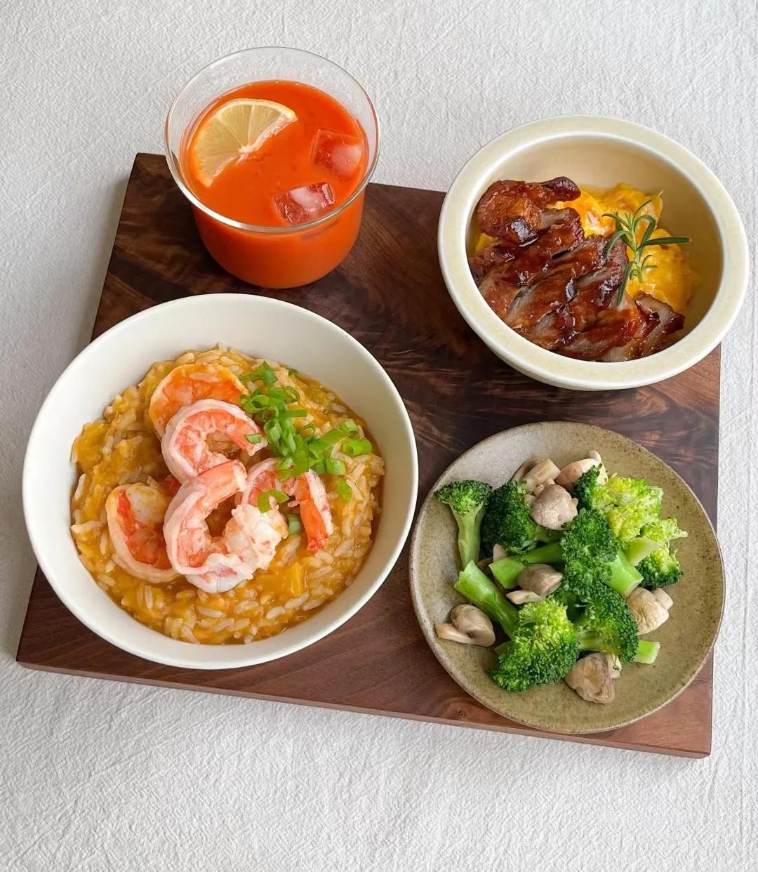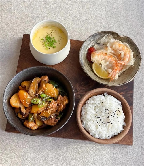 *照烧鸡排饭,虾仁炒西兰花,杂蔬汤,榨菜煎蛋*