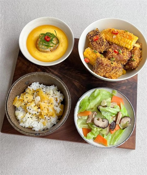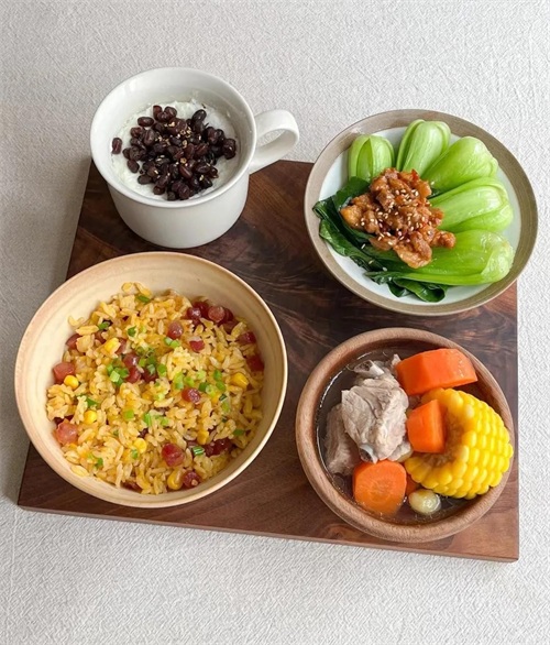 *腊肠鸡蛋炒饭,瘦肉炒青菜,玉米胡萝卜猪骨汤*