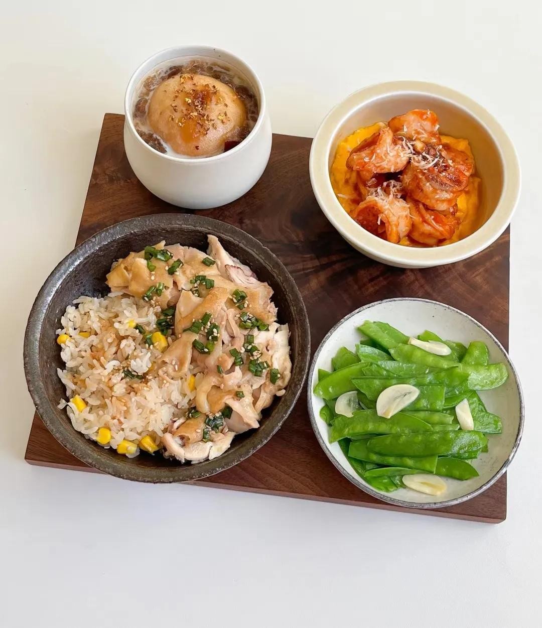 *葱香鸡肉盖饭,虾仁滑蛋,蒜炒荷兰豆*