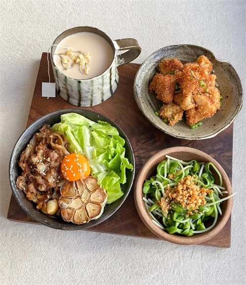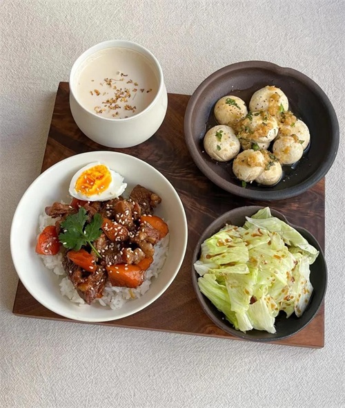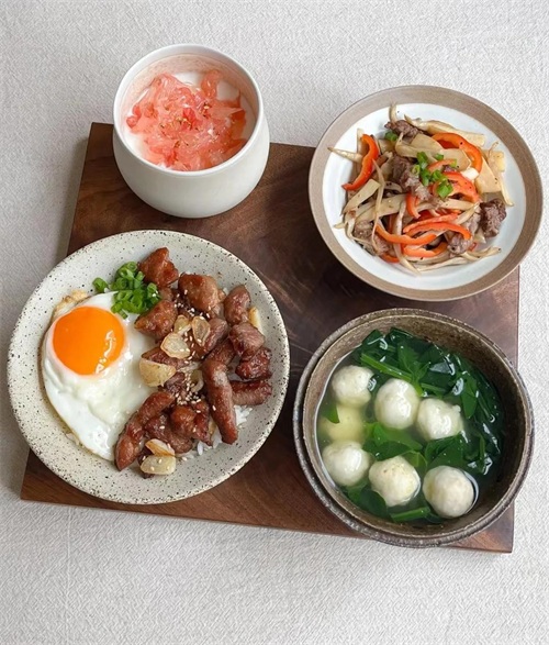 *牛肉炒杏鲍菇,鱼丸菠菜汤,烤肉鸡蛋盖饭*