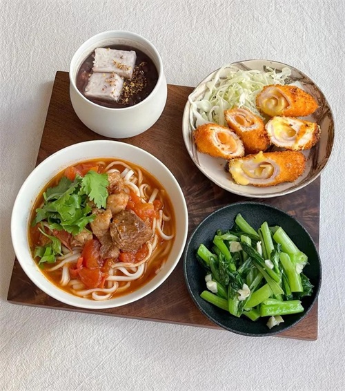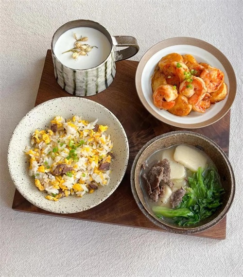 *牛肉粒蛋炒饭,虾仁炒玉子豆腐,牛肉年糕*