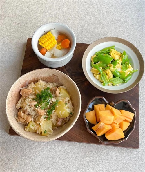 *萝卜玉米汤,尖椒炒鸡蛋,柿子,土豆鸡肉焖饭*