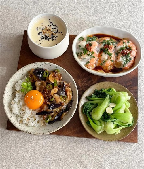 *蒜炒上海青,蒸虾仁春卷,尖椒炒茄子*