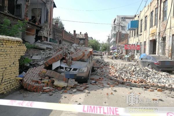 闻讯后,记者赶到现场看到,在道外区靖宇街与北十九街交叉口,北十九街一侧一栋围墙10多米的二层老楼倒塌。 城墙也被拆毁了。 一辆SUV被埋在倒塌的砖块下面。 车棚的屋顶已被压碎,车内乘客座位上也塞满了砖块。 路上也布满了掉落的砖块。 北十九街路东侧一辆黑色轿车左侧多处被砖块划伤。 事发现场已被封锁,相关人员正在疏散周围群众。