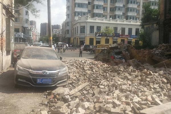 哈尔滨一老楼局部墙体坍塌 砸瘪一辆车
