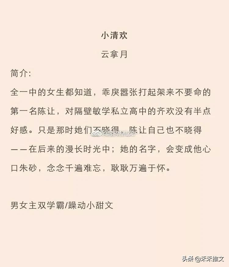 第一本小说是作者云拿月的小清欢,因为云拿月的小说,禾禾都已经看过了一遍了,有的小说甚至二刷三刷过好几遍嗯,都是非常有质量保障的(≧∇≦),可以放心的入坑。