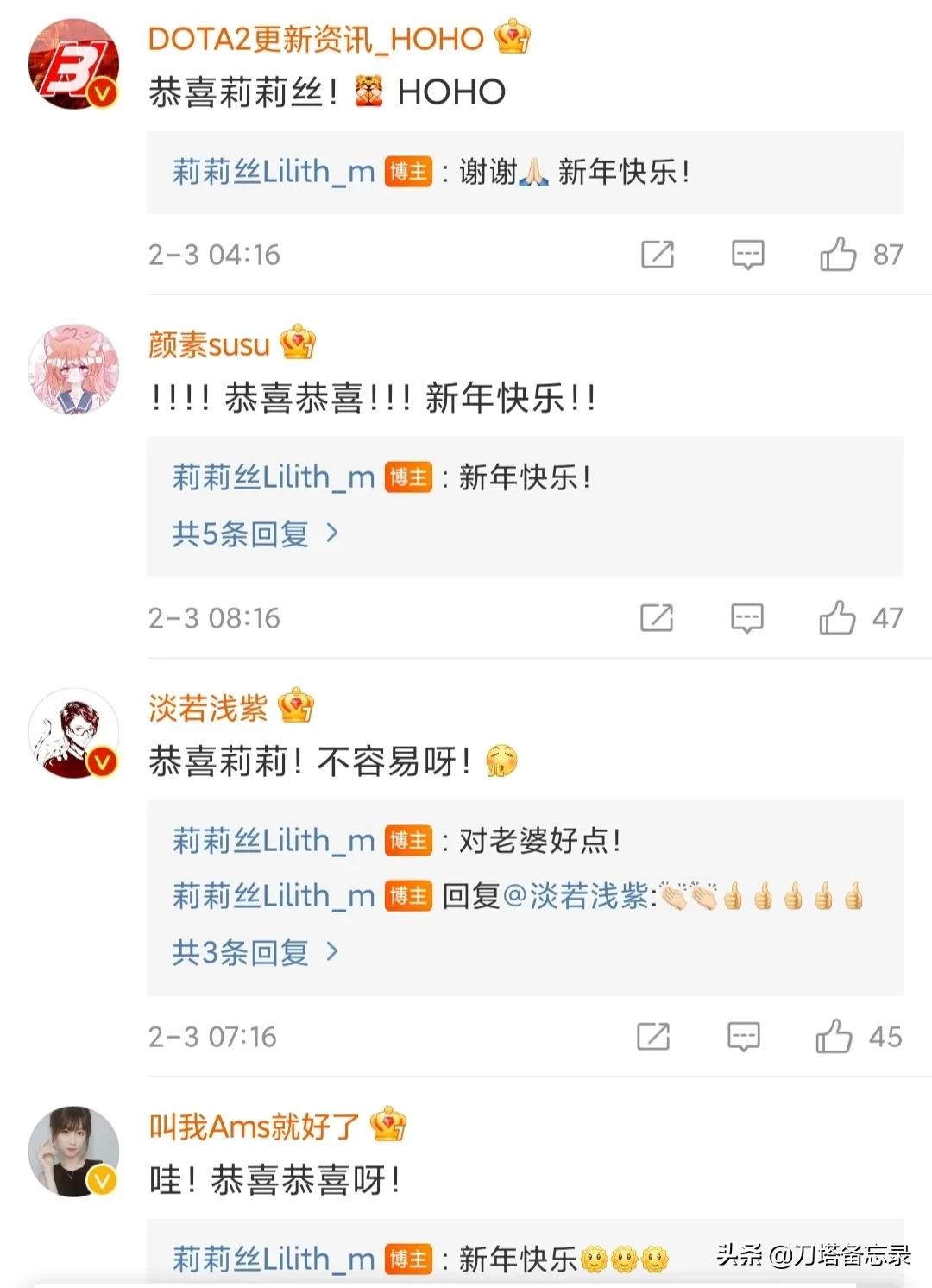 抛开众人的疑问,这时候还是祝愿莉莉丝母女幸福,新年快乐,菠萝赛东、海涛、hoho哥、ams等人也纷纷送上祝福的话。