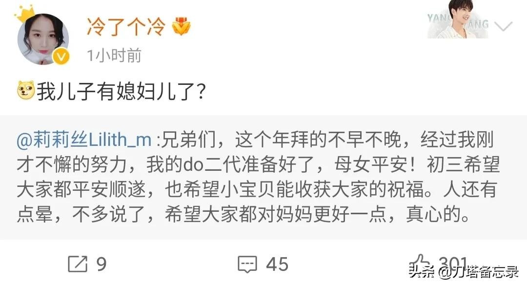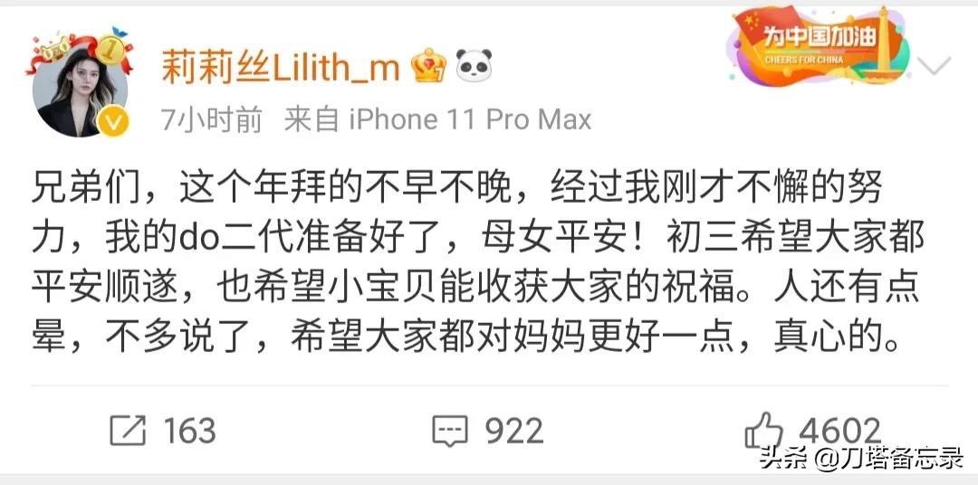 谁知就在大年初三,莉莉丝突然微博发文:兄弟们,这个年拜的不早不晚,经过我刚才不懈的努力,我的do二代准备好了,母女平安!初三希望大家都平安顺遂,也希望小宝贝能收获大家的祝福。人还有点晕,不多说了,希望大家都对妈妈更好一点,真心的。