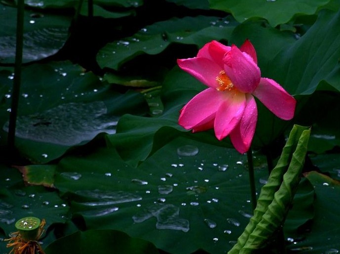 半夜里听见繁杂的雨声,早起是浓阴的天,我觉得有些烦闷。从窗内往外看时,那一朵白莲已经谢了,白瓣儿小船般散飘在水面。梗上只留个小小的莲蓬,和几根淡黄色的花须,那一朵红莲,昨夜还是菡萏的,今晨却开满了,亭亭地在绿叶中间立着。