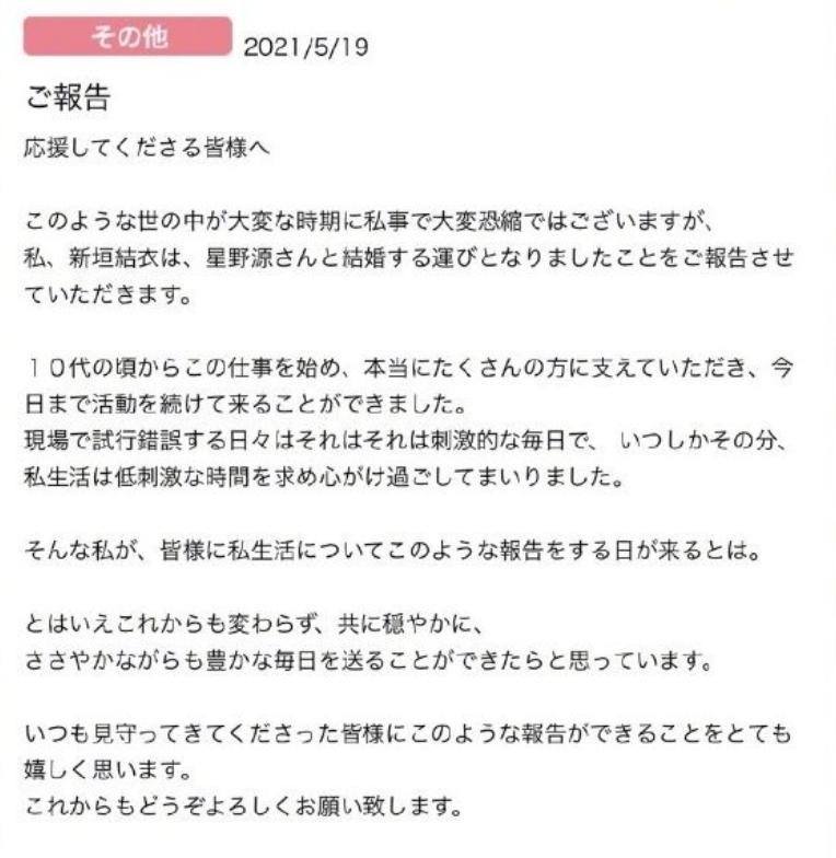 5月19日,据日媒报道,新垣结衣和星野源宣布结婚,荧幕cp在现实中成真。