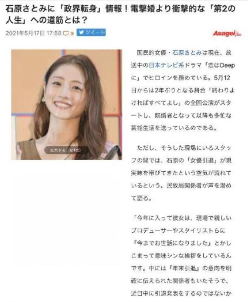 曝34岁石原里美疑要退圈,或将参加选举从政,嫁圈外男士事业平平