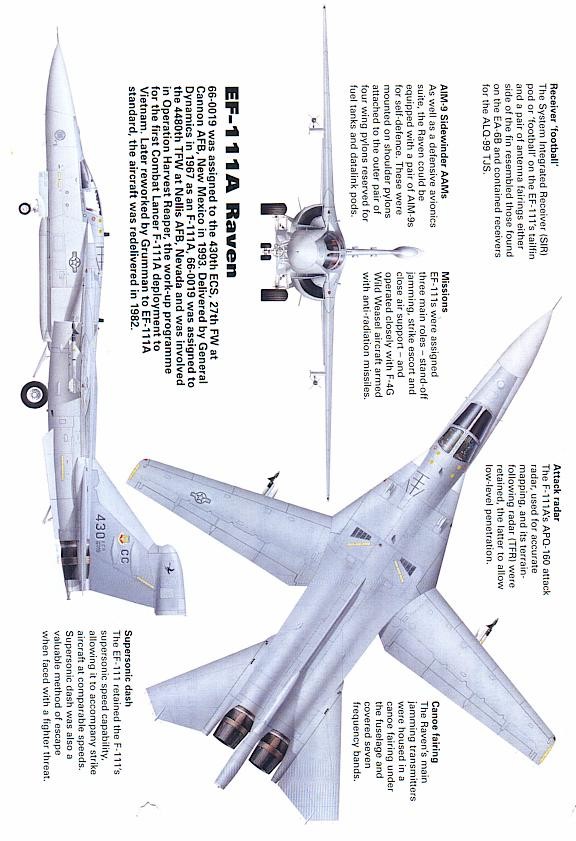 EF-111A:格鲁曼公司在A的基础上研制的电子对抗型号,主要执行远距干扰和突防护航任务。1981年服役。装备AN/ALQ-99E干扰系统,AN/ALQ-131(137)本机自卫干扰系统,AN/ALE-39(40)干扰弹发射装置,AN/ALR-62告警接收系统和AN/ALR-23红外侦察系统。标志是垂尾上方的大型电子战舱。