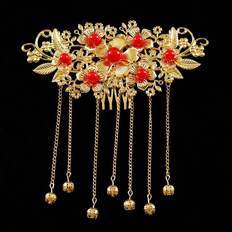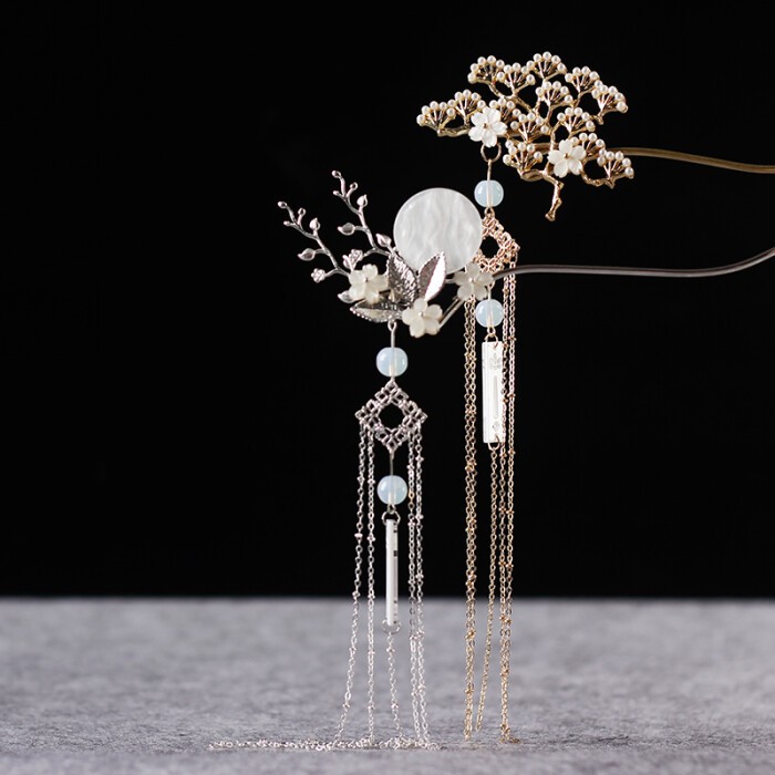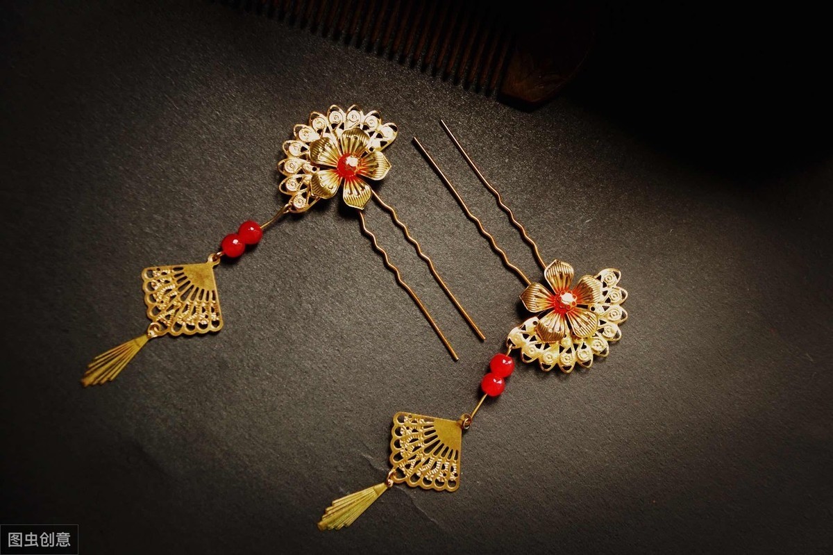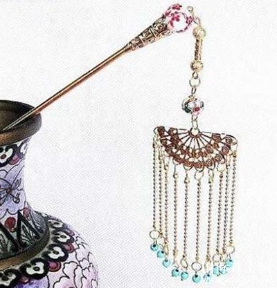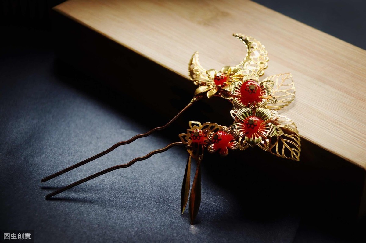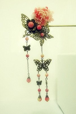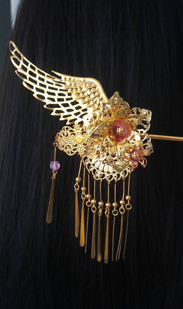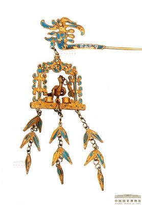 钗首多为凤凰、蝴蝶等形,上缀珠宝花饰,并有珠滴或坠子垂下,佩戴时插于 发际,行动处下垂的珠玉流苏便不停地摇曳,有着金光闪烁、步步摇颤的迷离效果,极富动感,自是别样动人。