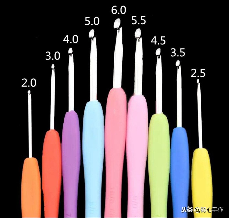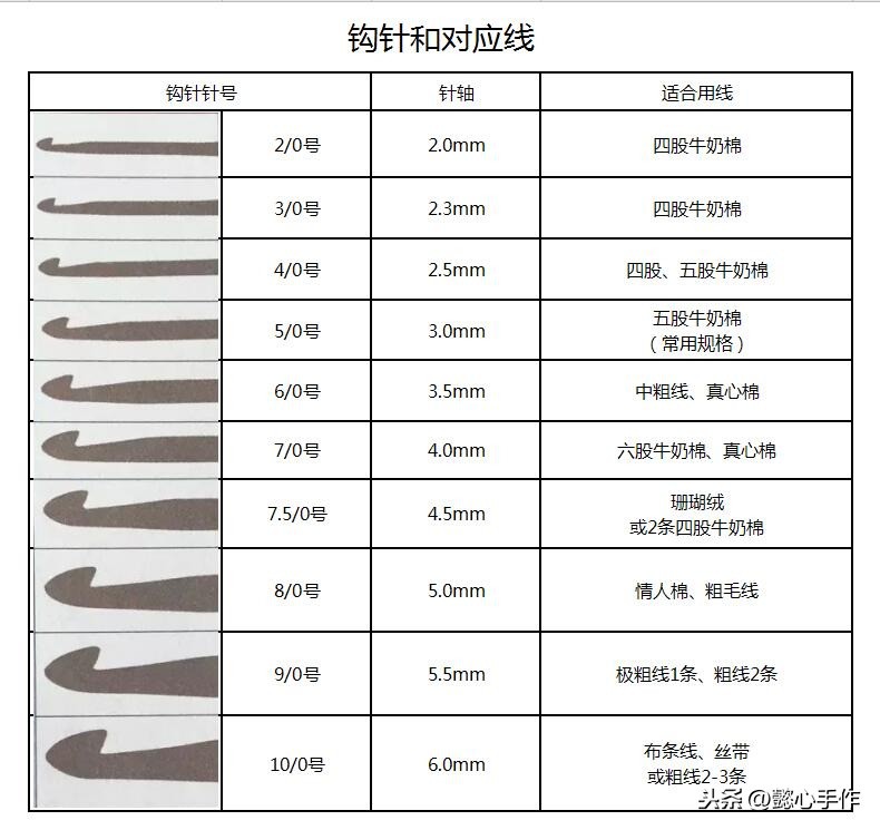 ①常规钩针有以下几个针号:针号越大,针轴越大,对应的线越粗。