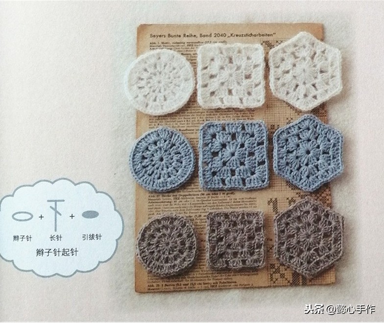 基础的几种针法:锁针,短针,中长针,长针,引拔针。