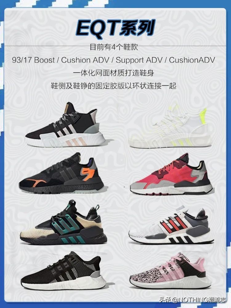EQT整体复古不失时尚感,配色出彩,目前有4个鞋款,93/17 Boost / Cushion ADV / Support ADV / Bask ADV,覆盖城市运动、复古机能,Boost 中底 / EVA大底等,可选范围广,价格也合理,也是目前adidas的销量主力军。