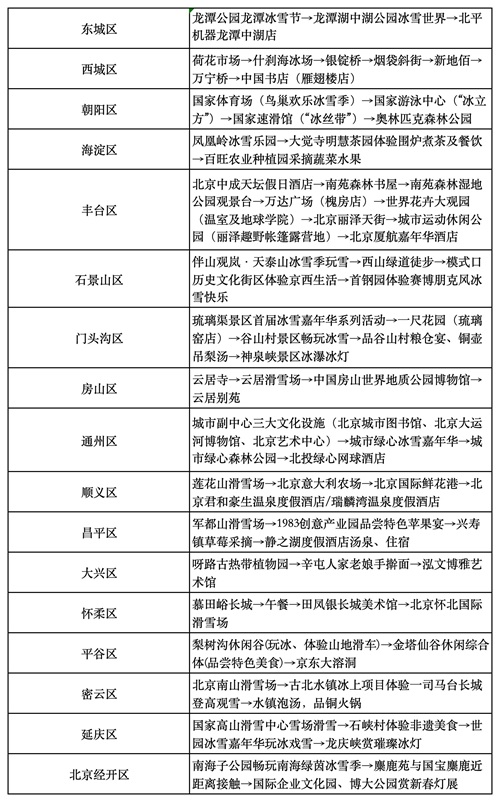 为突出北京冬奥场馆优势和“冰雪+”资源特色,北京市文化和旅游局举办“北京冰雪旅游季”活动,推出冬季冰雪手绘地图和34条特色线路,涵盖景区、雪场、公园、场馆等旅游场景,既有日间的滑雪嬉冰项目,又有夜间的冰灯、光影秀等内容,为广大市民、游客提供全天候多维度的冰雪文旅消费体验。