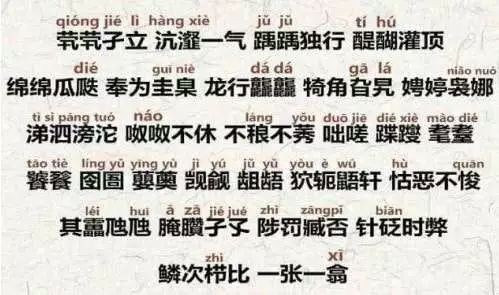 也许你听过这首歌,不知道你听清了没有?没关系,下面来看看其中几句歌词:茕茕 (qióng) 孑 (jié) 立,沆 (hàng) 瀣 (xiè) 一气,踽踽 (jǔ) 独行,醍 (tí)醐(hú)灌顶, 绵绵瓜瓞(dié),奉为圭 (guī)臬(niè), 龙行龘龘(dá),犄(jī)角旮 (gā)旯(lá), 娉(pīng)婷袅(niǎo)娜(nuó),涕(tī)泗(sì)滂(pāng)沱(tuó)、呶呶(náo)不休,不稂(làng)不莠(yǒu)。