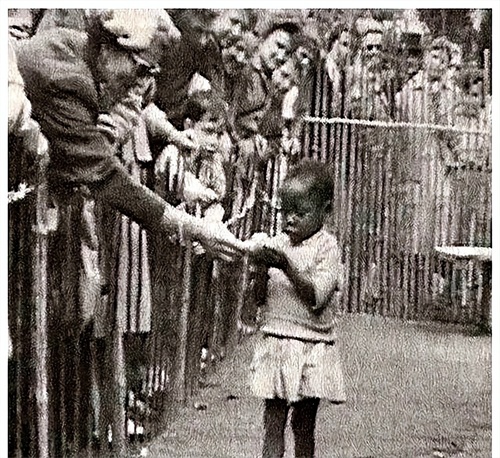 有些照片里,白人妇女给印第安小孩递食物,周围的白人则带着好奇和嘲弄的眼神看着这一切,仿佛在看马戏团的表演。