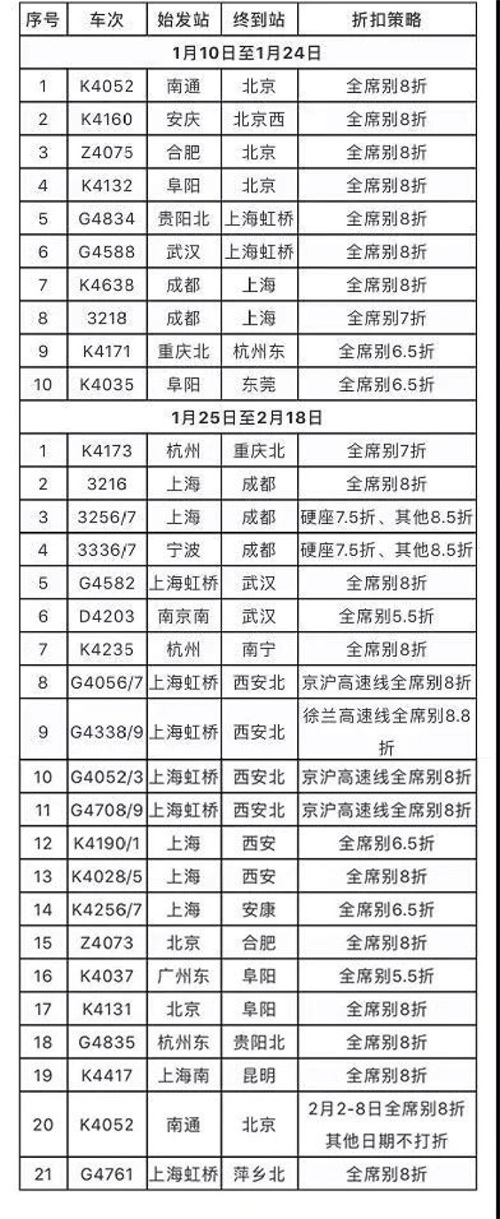 快报记者从铁路部门获悉,今年春运期间,将有部分铁路列车车票进行打折销售,以给予乘客更多的出行便利。