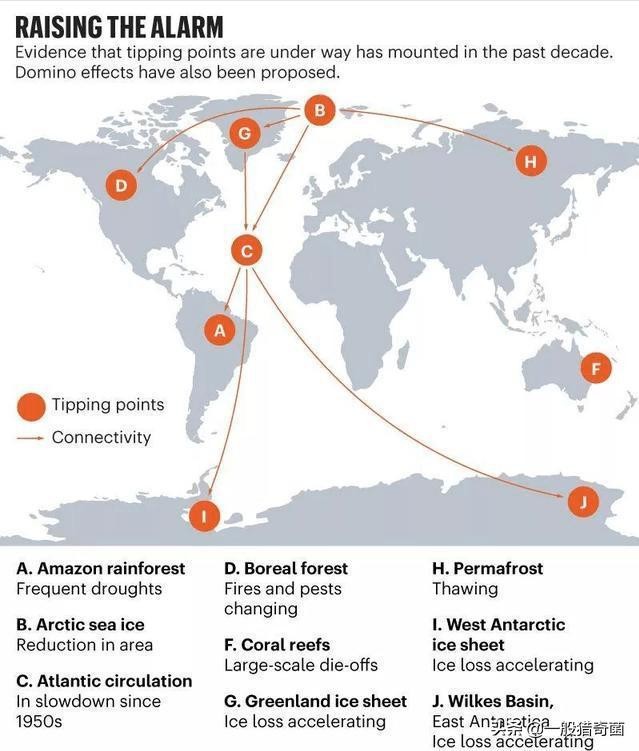 目前自然杂志已经识别出北美山火、亚马逊干旱、北极融冰等9个气候临界点。