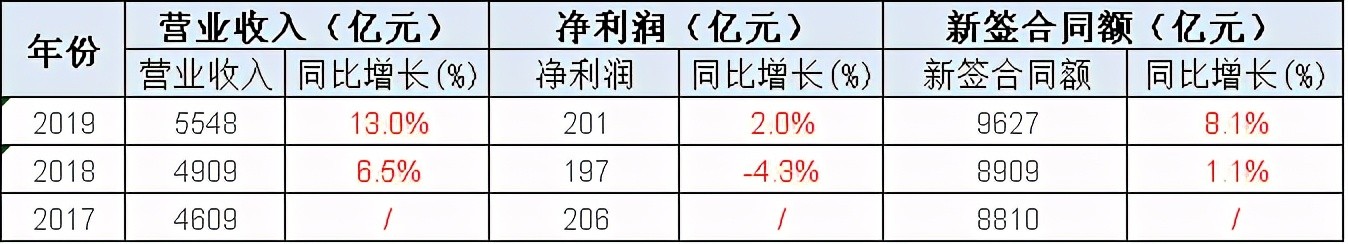 2019年中交实现营收5548亿,同比增长13%,净利润201亿元,同比增长2%,新签合同额9627亿元,同比增长8.1%。