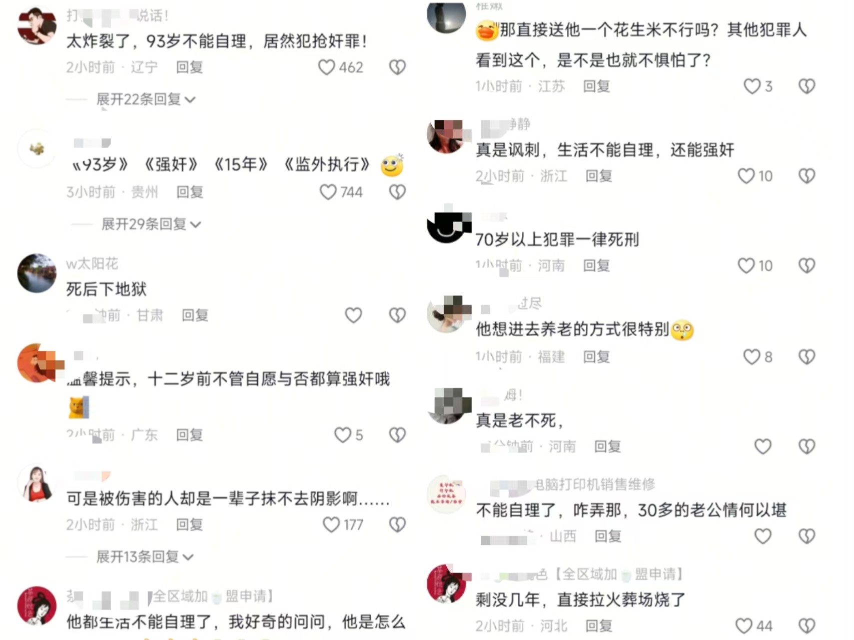 对此,网友们也是议论纷纷,先是震惊一个91岁时生活不能自理的人是如何完成性侵的,这让多少精力不济的中年人汗颜啊,更是吐槽这种坏人变老却无法采取惩戒,真是好人不长命,祸害活千年。