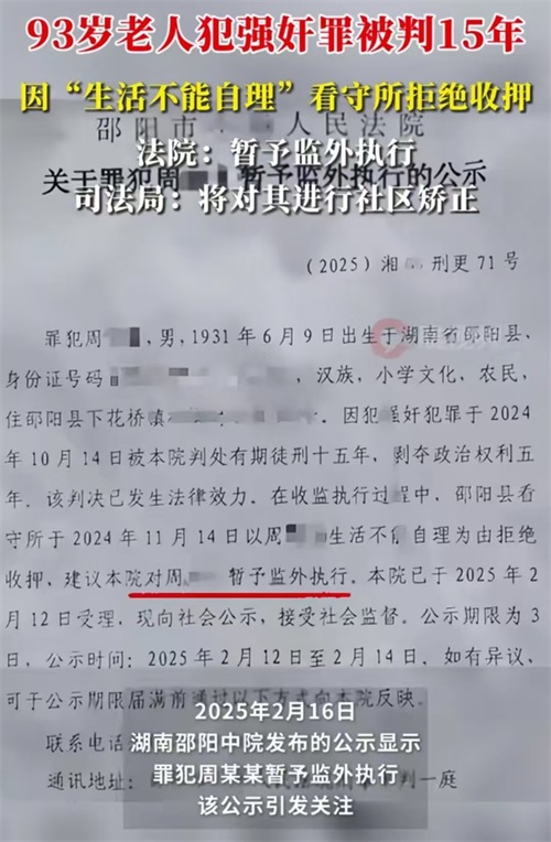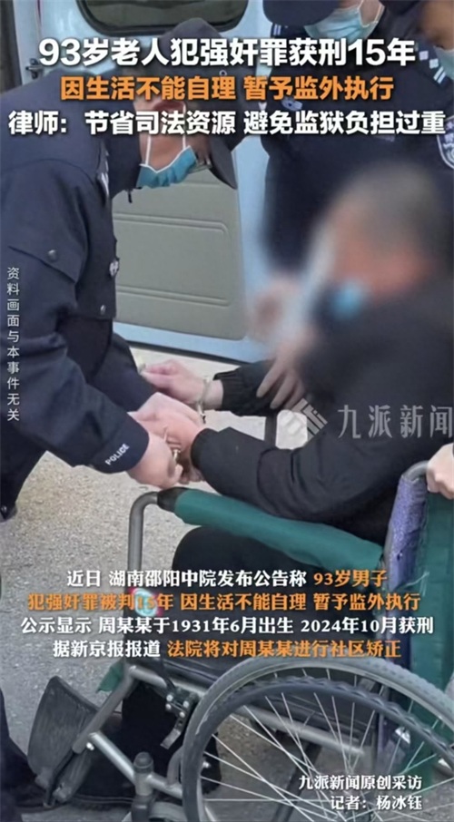 93岁老人犯强奸罪刑期15年,性侵未成年,生活不能自理监外执行!