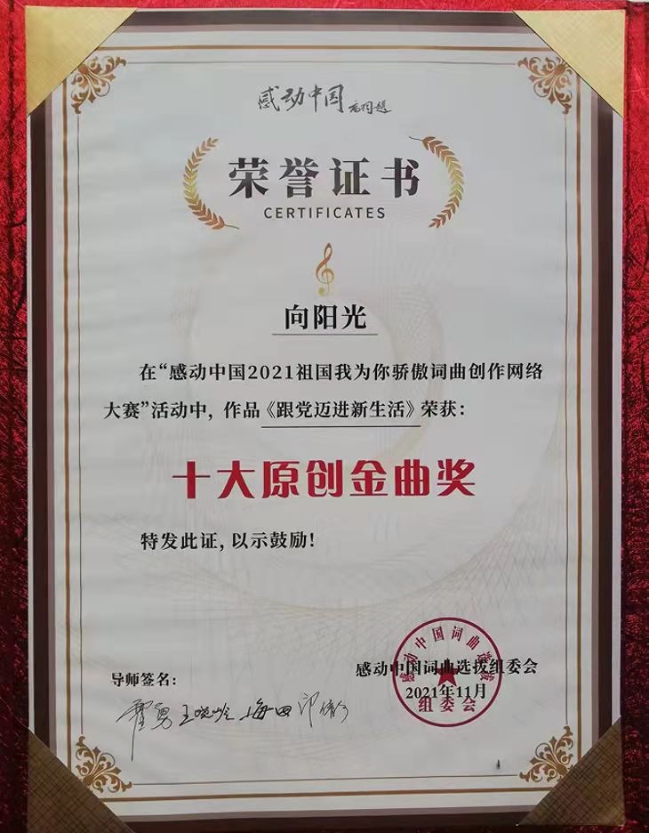 大赛组委会于2022.7.25在央视星光演播厅举行了“2022感动中国综艺盛典”,全程录像,现场直播,作品在央视的舞台上展示给了全国观众;《<跟党迈进新生活>内涵解读》等3篇音乐评论上了《湖南日报》(湘江周刊·艺风)、中宣部“学习强国”;《我的中华》《我们拥抱春天》等100余首歌曲入选《全国教师作曲家歌曲集》(上下)《中国当代优秀校园歌曲》《甜甜的歌-教坛作曲家特别专号》等10余部歌集。著有《音乐文化与素质教育》《中外音乐史学研究》《中国音教十家优秀歌曲专集》(向阳光优秀歌曲专辑)《向阳光声乐作品选》大型声乐套曲《临湘组歌》(十乐章)《五尖山之歌》(五乐章)等10余部,其中《音乐文化与素质教育》(课题专著):