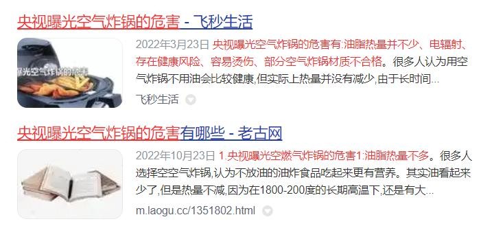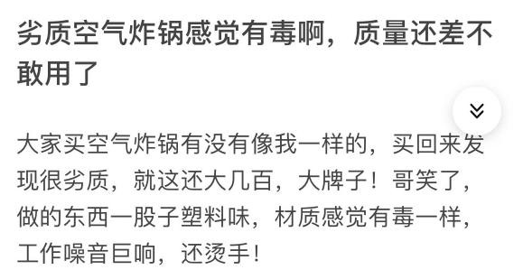 空气炸锅危害健康吗安全吗?空气炸锅从诞生之初,就是为人们健康和美食而服务的,原则上讲不会有危害,也不应该会有健康性安全性的问题,但实际情况却出乎所有人的意料。由于如今不专业空气炸锅日益泛滥,它们做工用料差,性能缺陷大,普通人又难以辨别,容易上当入手,因此其对人体健康安全的危害时有发生,引发了人们普遍的担忧和议论(见下图),因此接下来,我们就来说说其常见的四大坏处隐患: