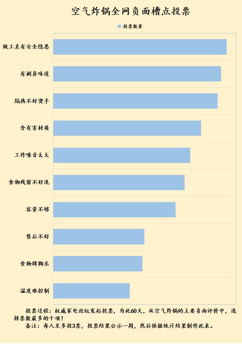 空气炸锅危害健康吗安全吗?不专业空气炸锅的盛行,无疑给人体的健康和安全肇启了祸端,而且从实际情况来看,其引发危害的危险因素非常多,关于这一点,大家可以看下面这份空气炸锅负面评价的统计图,完全证明了我们所说非虚。而不专业空气炸锅之所以会有这么多流入用户手中,根本原因就在于无良商家为了赚钱,精心设计了各种套路,诱骗大家买它们的性能低劣的产品,所以我们有必要对这些做个彻底的了解,下面我们就着重说说其中较为重要的四大套路: