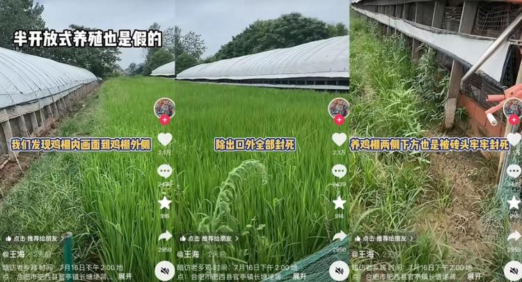 此前在博主B太的探访视频中,老乡鸡合作农户养殖场的鸡群在半封闭的草地上自由散步。爆料视频中却是另一番画面:同样的地点非但没有鸡群,杂草也长得很高,养殖场是全封闭状态。王海直言“老乡鸡把B太也骗了”。
