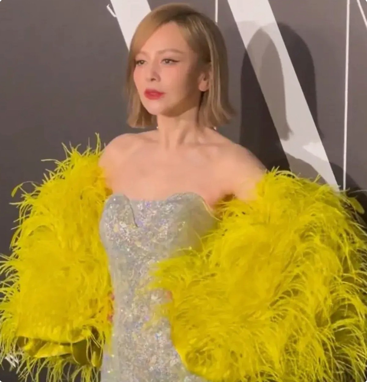 红毯上,她一身镶满亮钻的紧身礼裙,搭配夸张的荧光黄披肩,身材紧致性感,整体的造型更有民国贵妇的气场,举手投足的优雅,让人目不转睛,难以忽视。