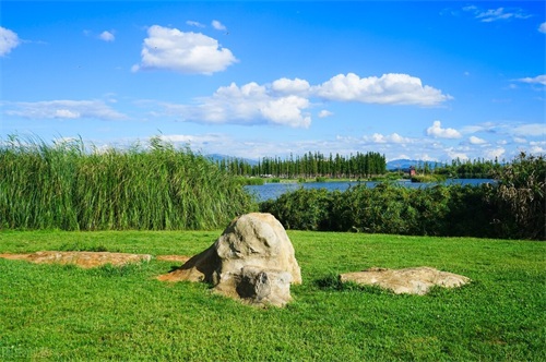 景区里还有一大块草坪,芳草鲜美,树木枝繁叶茂,碧水蓝天的美景,清新而又美好,有一种回归大自然的感觉,