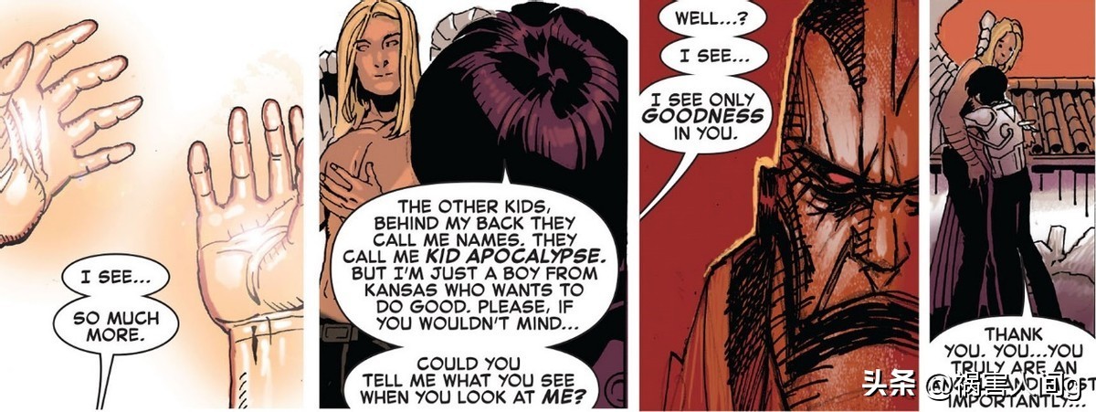 埃文知道沃伦拥有看穿别人本质的能力,他问沃伦从自己身上看到了什么,沃伦告诉他,他只看到了善良,但是其实沃伦在埃文身上只看到了天启。
